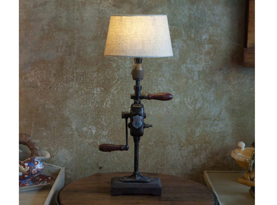 Ein absolutes Unikat aus den 1940-50er Jahren, das aus Nähmaschinenteilen gefertigt und liebevoll mit einem schönen mittelgrauen Lampenschirm kombiniert wurde, der den Stand genau ergänzt. Eine wunderbare und harmonische Kombination, die ein Highlight in jedem Raum ist.